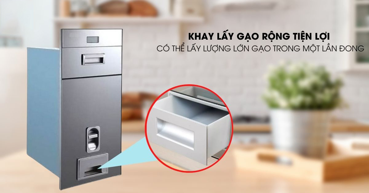 Sản phẩm được trang bị khay lấy hứng gạo ngay sau khi lấy ở phía trước thùng gạo. Nếu như trước kia bạn thường phải đong gạo bằng ca nên mỗi khi lấy gạo phải cúi người xuống lấy, với tay vào trong thùng và phải đong nhiều lần thì bây giờ với thùng gạo thông minh B301 bạn có thể lấy 600g gạo/1 lần đong.