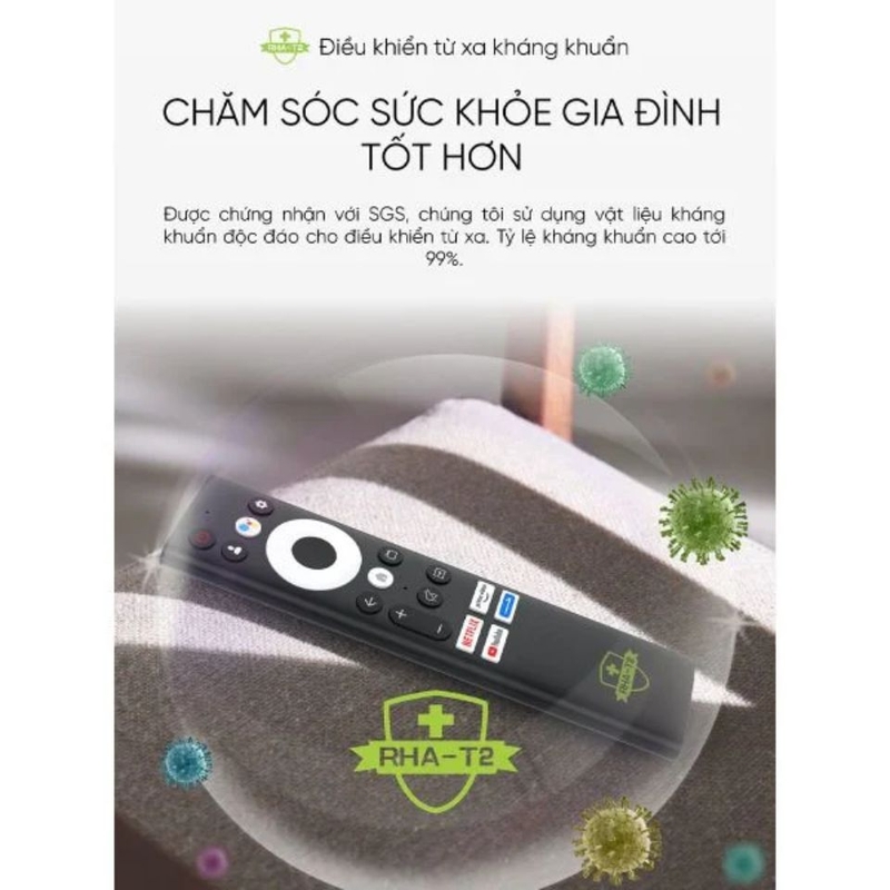 Remote của tivi Coocaa 65Y73 Pro được chế tạo từ vật liệu kháng khuẩn cao cấp để giảm thiểu vi khuẩn và mầm bệnh. Được chứng nhận bởi SGS, thiết bị này có khả năng kháng khuẩn lên đến 99%, đem đến sự an toàn cho người dùng. Nhờ đó, remote phù hợp cho gia đình đông người, đặc biệt khi có trẻ nhỏ hoặc các thành viên thường xuyên sử dụng.