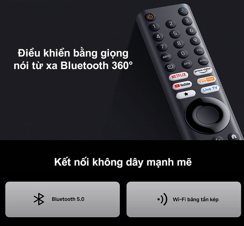 Chiếc điều khiển từ xa Bluetooth 5.0 đi kèm còn mang đến sự tiện lợi tối đa nhờ khả năng nhận tín hiệu 360 độ, không cần hướng thẳng vào tivi. Tích hợp điều khiển giọng nói và các phím chức năng tùy biến linh hoạt, remote này giúp việc thao tác trở nên nhanh chóng, tiện nghi và cá nhân hóa hơn bao giờ hết.