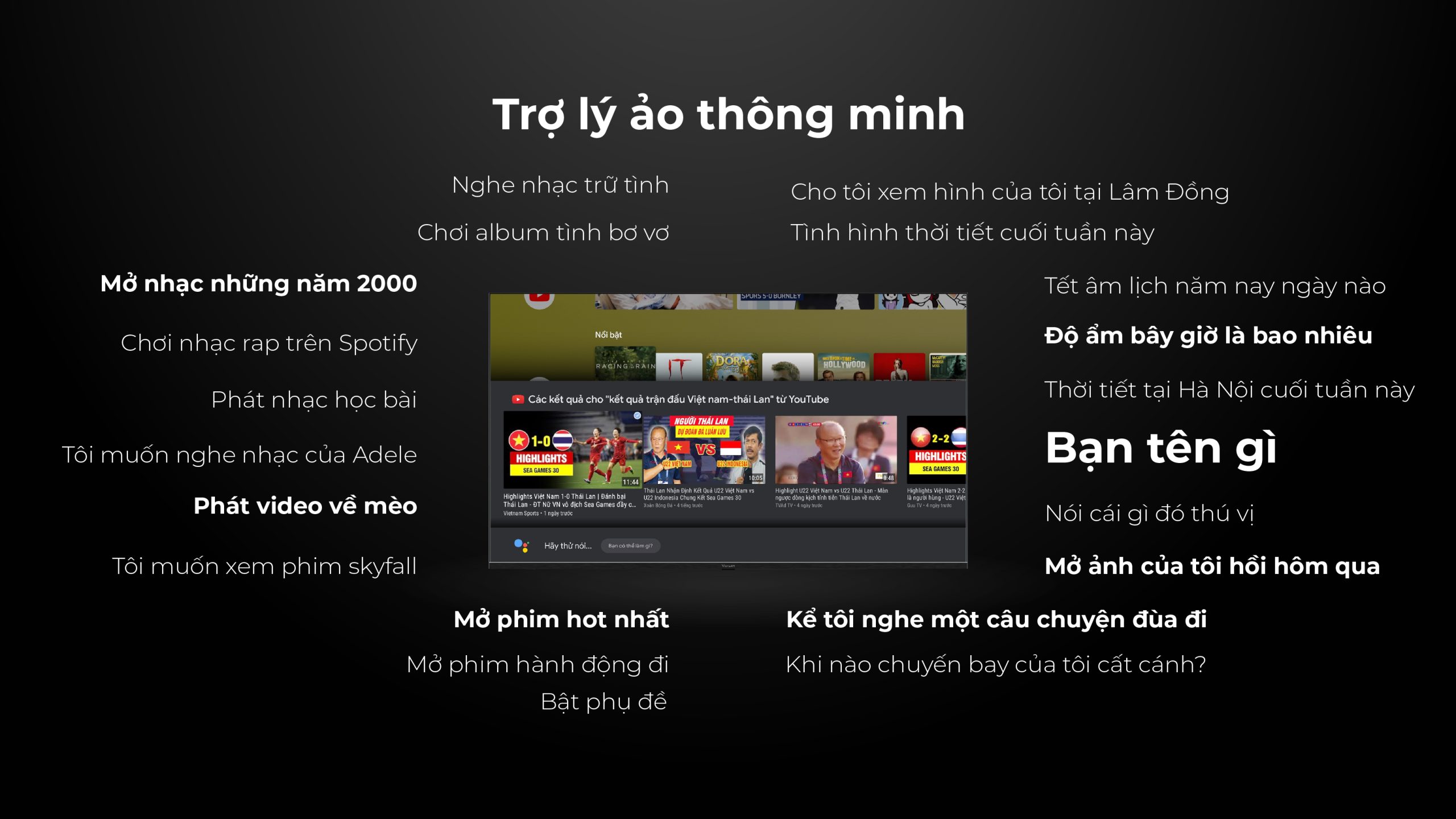 Trợ lý ảo cho phép điều khiển TV bằng giọng nói Tiếng Việt: tăng giảm âm lượng, mở ứng dụng, mở bài hát, chương trình TV yêu thích, hỗ trợ tìm kiếm thông tin và nhiều tính năng thông minh khác.