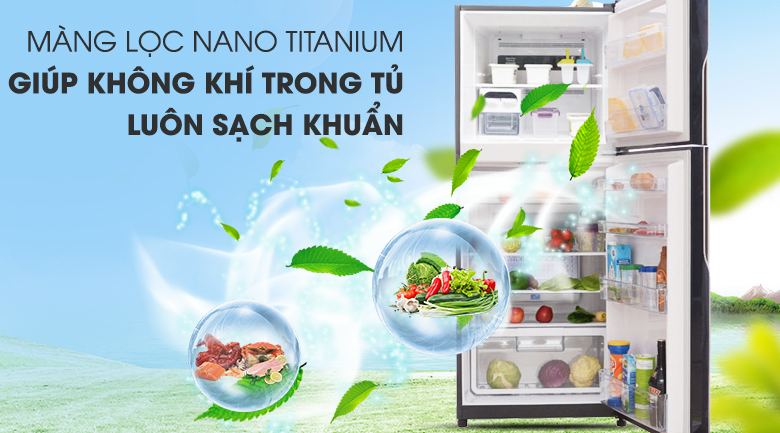 Với công nghệ diệt khuẩn khử mùi bằng màng lọc Nano Titanium, những vi khuẩn hoặc nấm mốc có kích thước từ nano trở lên đều bị giữ lại và tiêu diệt, giúp lọc sạch đến 99,9% những vi khuẩn có hại trong tủ lạnh, đảm bảo không khí trong tủ lạnh luôn tinh khiết để thực phẩm được giữ vệ sinh cao.