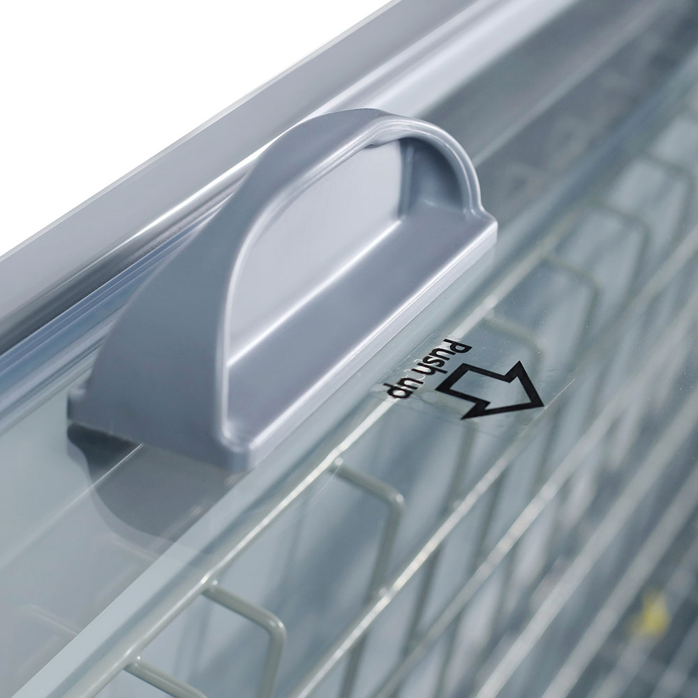- Thiết kế cửa kính đặc biệt mở trượt lên (thay vì trượt ngang) cho phép ít nhất 2 khách hàng sử dụng tủ cùng 1 lúc.