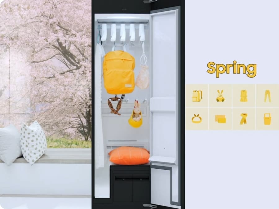 Với móc treo đa năng nằm ở giữa Air Dresser, bạn có thể chăm sóc nhiều vật dụng khác nhau như túi xách và búp bê theo mùa. Bạn sử dụng Air Dresser với móc treo đa năng để chăm sóc túi xách và búp bê vào mùa xuân, đồ bơi vào mùa hè, đồ đi bộ đường dài vào mùa thu và đệm và khăn quàng cổ vào mùa đông.