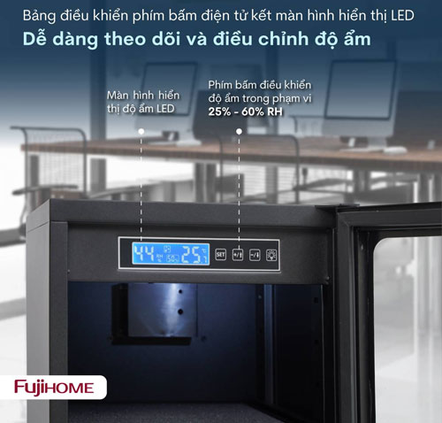 Tủ chống ẩm Fujihome DC-30E trang bị hệ thống điều chỉnh độ ẩm bằng phím bấm điện tử bên ngoài cho phép thao tác dễ dàng, với phạm vi điều chỉnh độ ẩm từ 25% – 60% RH sẽ phù hợp cho nhiều loại thiết bị khác nhau.