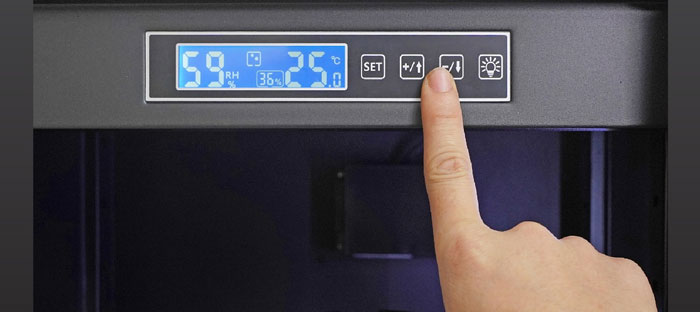 Tủ có trang bị phím bấm điện tử bên ngoài cho phép điều chỉnh độ ẩm dễ dàng với phạm vi từ 25% – 60% RH, đáp ứng nhiều nhu cầu bảo quản khác nhau của người dùng.
