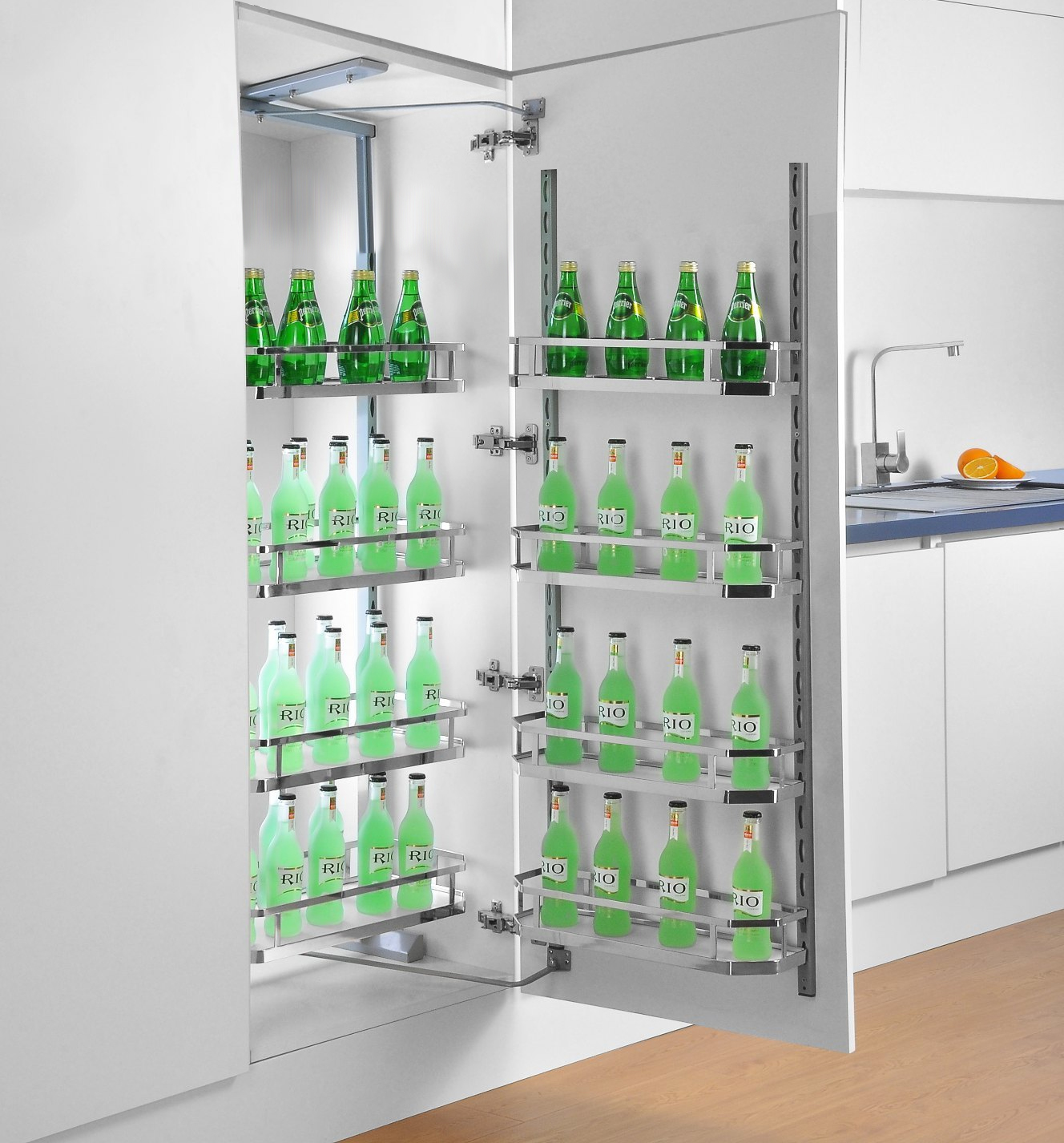 Thay vì xếp đồ đạc một cách không khoa học tạo nên sự bề bộn cho bếp thì hệ tủ kho chứa đồ khô sẽ giúp căn bếp luôn sạch sẽ, gọn gàng. Thiết kế 4 tầng, 8 rổ đựng, rổ lớn có thể chứa 5kg và rổ nhỏ có thể chứa 3kg bạn có thể tha hồ cất gọn tất cả các vật dùng, đồ ăn.. vào khoang tủ phía sau cánh cửa tủ.