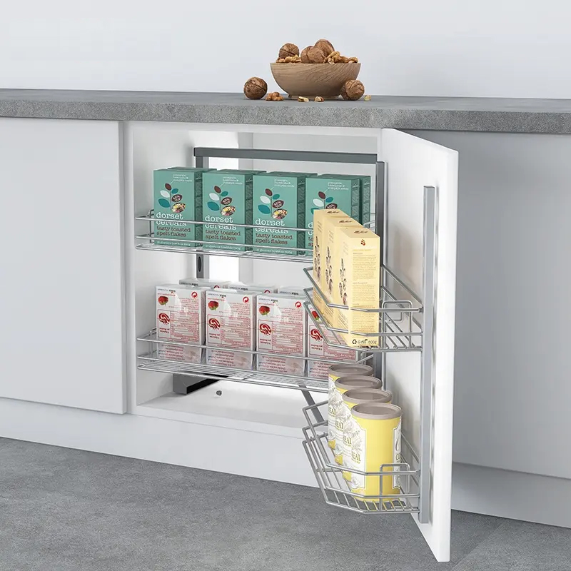 Thay vì xếp đồ đạc một cách không khoa học tạo nên sự bề bộn cho bếp thì hệ tủ kho chứa đồ khô sẽ giúp căn bếp luôn sạch sẽ, gọn gàng. Thiết kế 2 tầng, 4 rổ đựng, rổ lớn có thể chứa 5kg và rổ nhỏ có thể chứa 3kg bạn có thể tha hồ cất gọn tất cả các vật dùng, đồ ăn.. vào khoang tủ phía sau cánh cửa tủ.