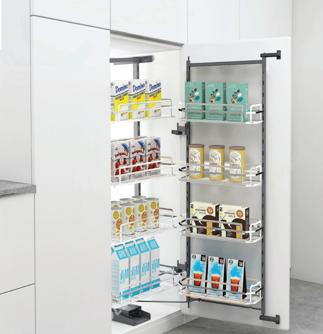 Hệ tủ kho Eurogold EPL80445 chứa đồ khô có bộ cơ cấu trượt vô cùng chắc chắn, tích hợp giảm chấn, giúp bạn đóng mở nhẹ nhàng, êm ái không hề tạo ra tiếng ồn khi kéo cánh.