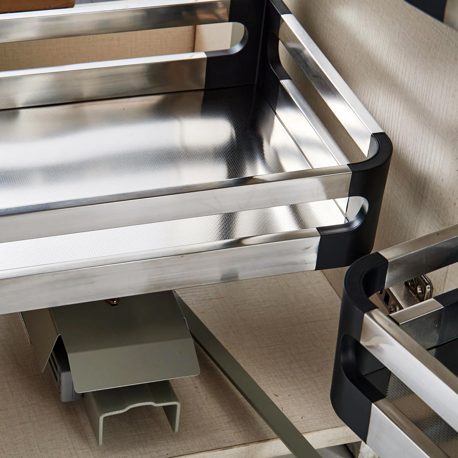 Thiết kế trượt đôi, tăng cường khả năng chịu tải của sản phẩm và giữ cho phần kéo ra ổn định. Công nghệ Đức, chịu tải siêu cao, thanh dẫn hướng cấu trúc con lăn mở rộng, cấu trúc liên kết đơn giản và hoàn toàn mới, kéo giỏ bên trong ra khi mở cửa. Điểm chịu tải của cửa tủ tập trung vào đáy tủ, bảo vệ cửa không bị biến dạng.