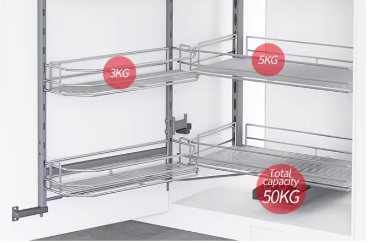 Các khay đựng được thiết kế linh hoạt phù hợp với nhiều kích thước chai lọ, gia vị, đồ khô… khác nhau trong không gian bếp.