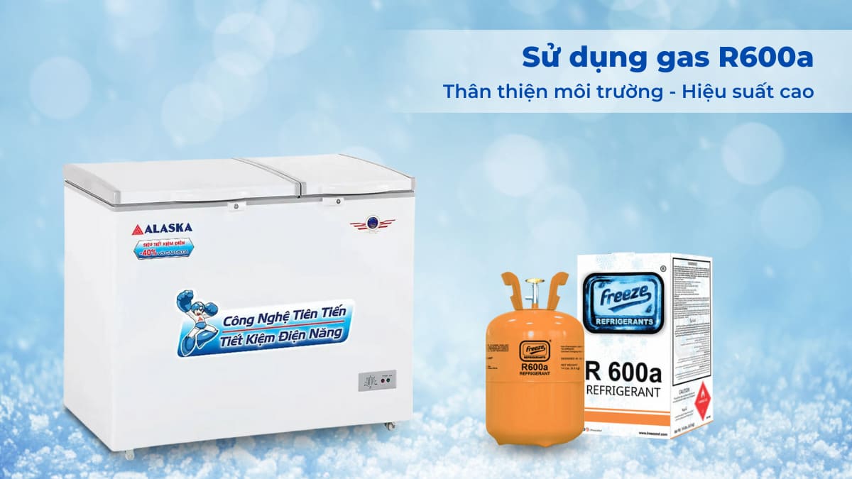 Tủ Đông Mát Alaska BCD-3571 đã sử dụng gas R600a để làm lạnh. R600a vốn được biết đến là dòng gas thế hệ mới, có hiệu suất làm lạnh cao, nhờ đó máy nén không phải hoạt động quá nhiều vẫn cung cấp đủ hơi lạnh cho toàn bộ thực phẩm. Vì vậy việc sử dụng gas R600a sẽ giúp cho tủ đông Alaska này giảm thiểu lượng điện tiêu thụ đáng kể. Ngoài ra, gas R600a không chứa các chất gây ảnh hưởng đến tầng Ozon cũng như là môi trường nên người dùng có thể an tâm sử dụng trong thời gian dài.