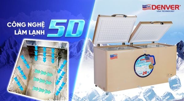 Không giống các dòng tủ đông truyền thống với dàn lạnh quấn xung quanh thành tủ đơn giản, công nghệ 5D của Denver khắc phục tình trạng chênh lệch nhiệt độ thường thấy – nơi thực phẩm gần thành tủ lạnh hơn nhưng giữa tủ hoặc đáy lại thiếu hơi lạnh. Dàn lạnh quanh thành tủ đảm bảo luồng khí lạnh bao phủ từ các phía, trong khi dàn lạnh dưới đáy đẩy hơi lạnh từ dưới lên, tạo hiệu ứng tuần hoàn tự nhiên. Với công nghệ này, tủ đông Denver trở thành lựa chọn lý tưởng cho việc bảo quản thực phẩm số lượng lớn, từ gia đình đến nhà hàng, đảm bảo mọi sản phẩm đều được bảo vệ tối ưu trong môi trường lạnh đồng nhất.