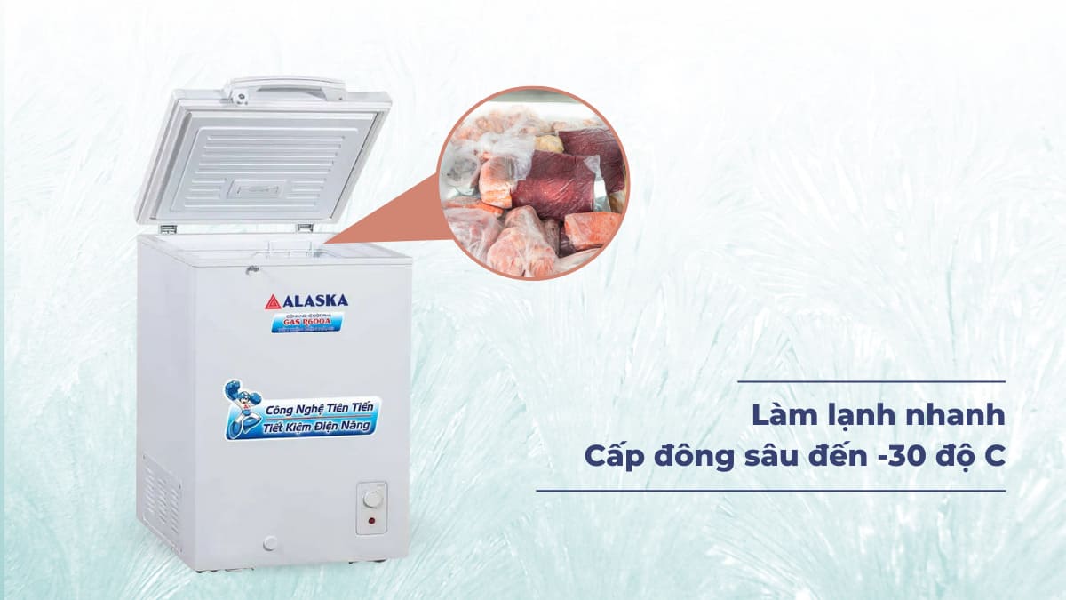 Tủ Đông Alaska 103 Lít BD-150 có khả năng làm lạnh nhanh và sâu đến – 30 độ C. Nhờ đó người dùng có thể cấp đông cho những thực phẩm tươi sống một cách nhanh chóng để giữ nguyên được chất dinh dưỡng vốn có.