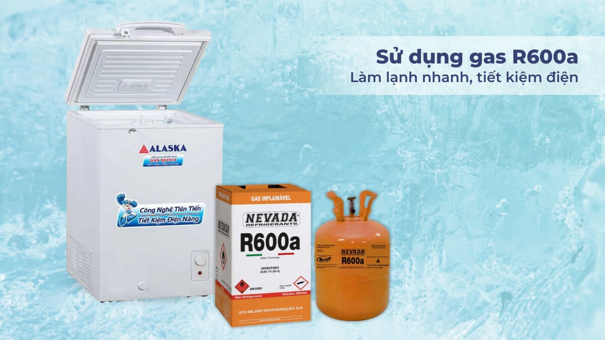 Tủ đông Alaska này sử dụng gas R600a – môi chất làm lạnh tiên tiến được sử dụng trên nhiều dòng tủ đông, tủ lạnh mới hiện nay. Gas R600a có hiệu suất làm lạnh cao nên giúp tủ tiết kiệm đáng kể lượng điện tiêu thụ. Hơn nữa loại gas này cũng giúp tủ giữ mức nhiệt ổn định để bảo quản thực phẩm tốt hơn.