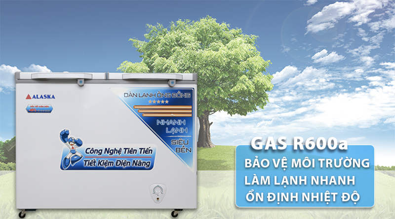 Ngoài khả năng làm lạnh nhanh chóng tủ đông Alaska với gas R600a còn vô cùng thân thiện với môi trường, không gây ra hiệu ứng nhà kính nguy hiểm. Đồng thời khi sử dụng gas R600a, bạn còn có thể tiết kiệm được lên đến 40% điện năng hàng tháng cho gia đình đấy.