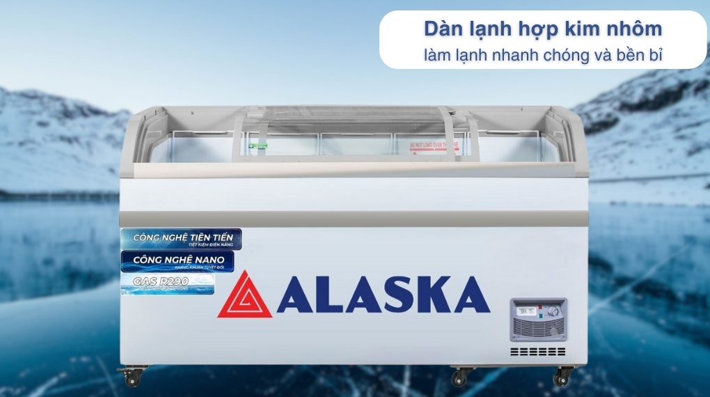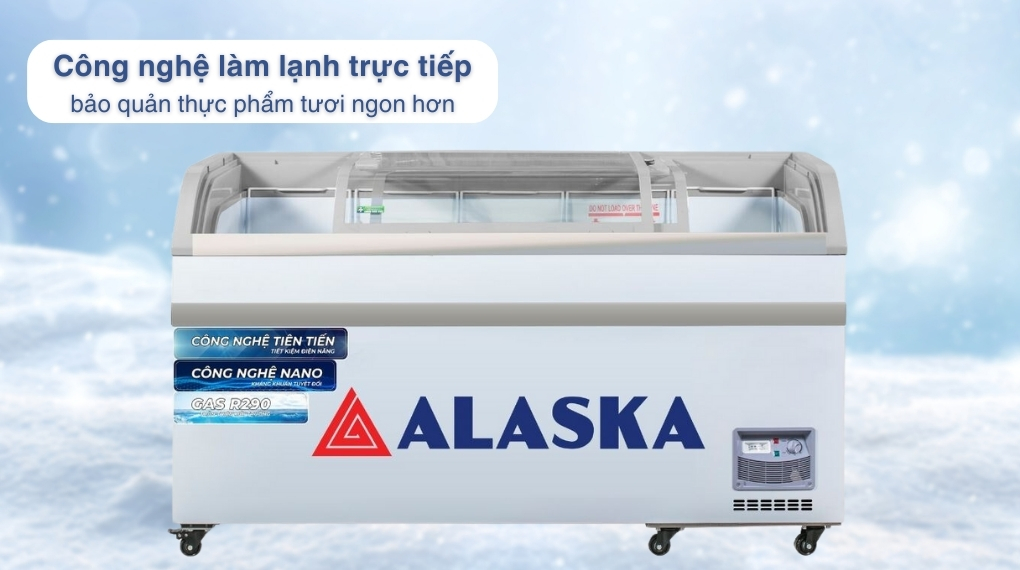 – Tủ đông Alaska 395 lít KC-395 thuộc kiểu tủ đông nằm có thiết kế 1 ngăn đông và 2 cửa trượt. Tủ có thiết kế bày hàng kính cong bằng kính cường lực có độ bền cao, dễ quan sát thực phẩm bên trong.
