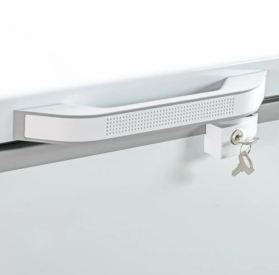 Để tránh tình trạng trẻ đóng, mở cửa nhiều lần gây thất thoát hơi lạnh bên trong hoặc bị té ngã gây hiểm đến tính mạng, tủ đông đã trang bị khóa an toàn.
