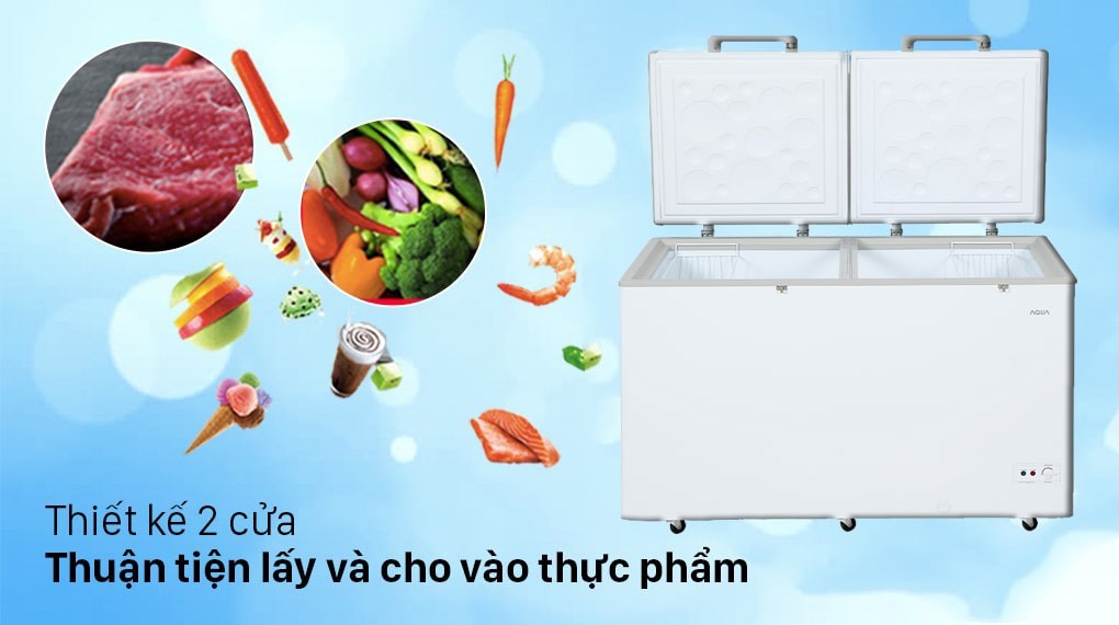 AQUA Inverter AQF-C5701E được thiết kế 2 cửa, thuận tiện cho người dùng khi thao tác lấy và cho vào thực phẩm bên trong tủ đông, đồng thời giảm thiểu được tình trạng hơi lạnh thoát ra bên ngoài nhằm góp phần tiết kiệm điện hiệu quả.