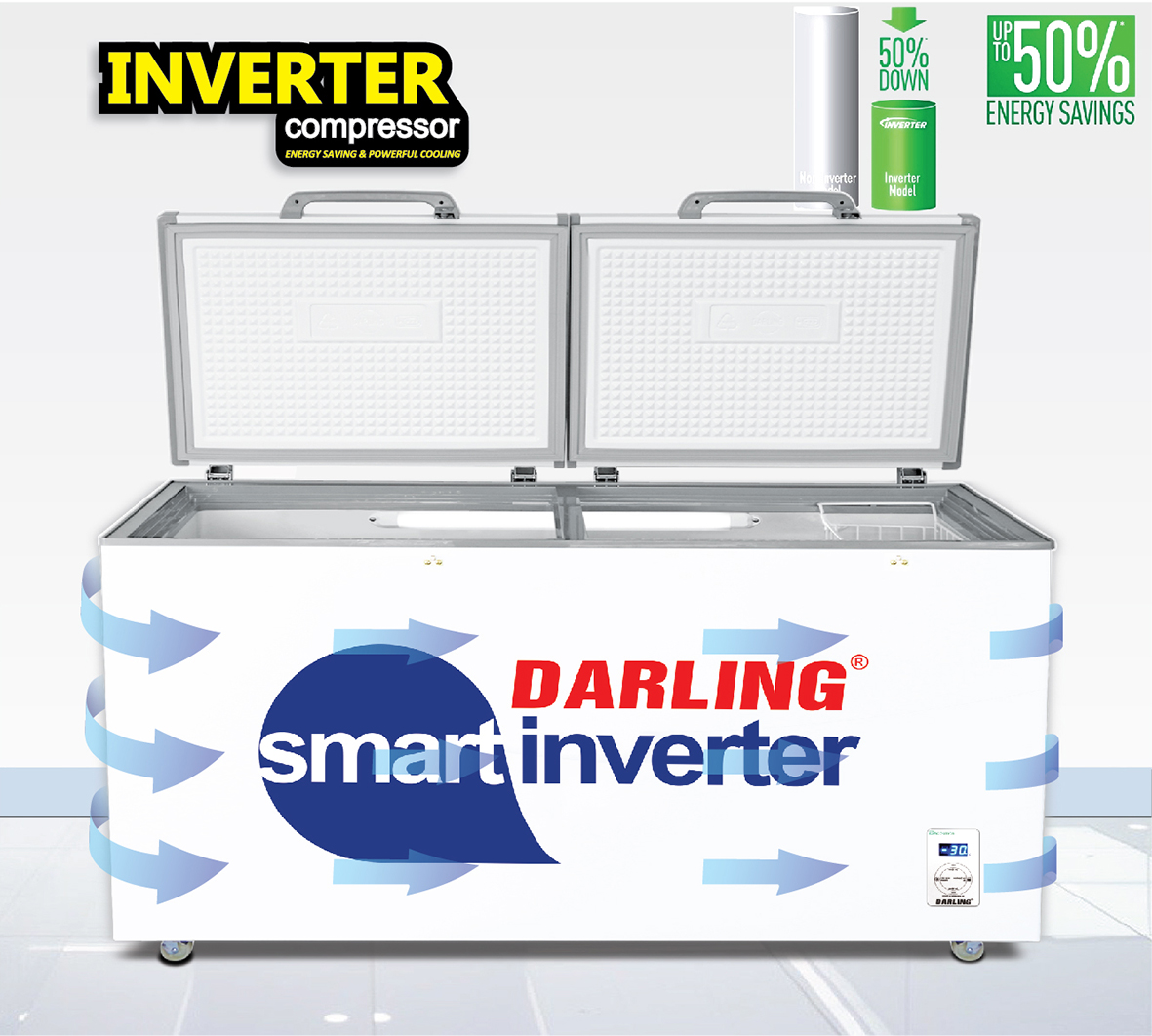 Dòng tủ đông Darling sử dụng công nghệ biến tần INVERTER có khả năng điều chỉnh vòng quay của máy nén, duy trì nhiệt độ hoạt động ổn định, giúp tủ vận hành vô cùng êm ái và tiết kiệm điện năng hiệu quả, khả năng vận hành bền bỉ đem đến sự bảo quản thực phẩm tuyệt vời cho bạn.