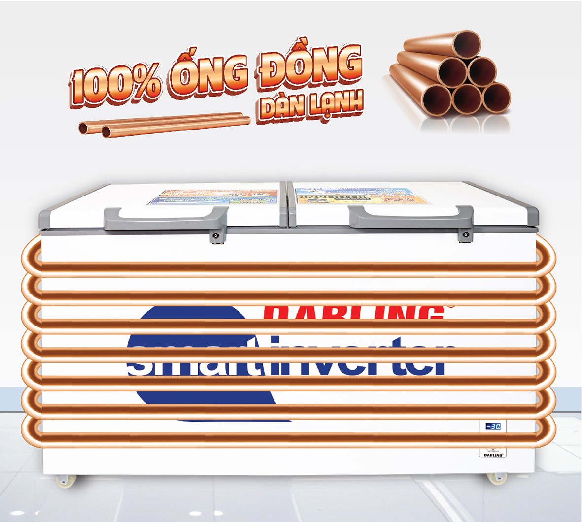 Dòng tủ đông Darling sử dụng dàn lạnh ống đồng cực kỳ bền chắc, có khả năng làm lạnh siêu nhanh, giữ nhiệt lâu nhất và tiết kiệm điện.