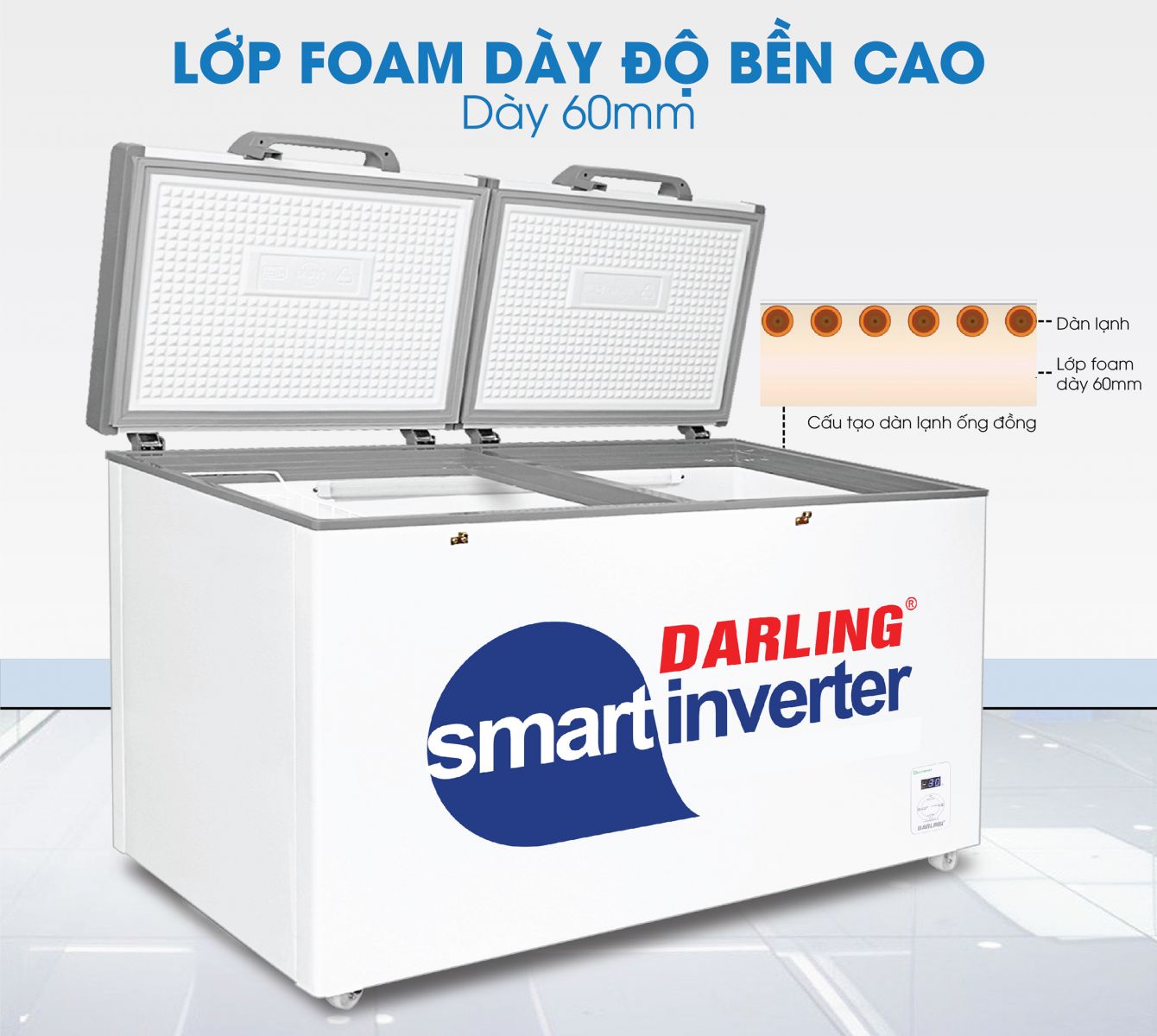 Lớp Foam dày được trang bị bên trong lòng tủ đông Darling giúp giữ lạnh tốt, cách nhiệt hiệu quả và giảm thất thoát hơi lạnh.