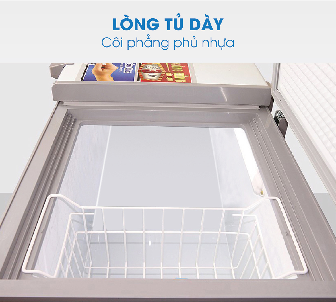 Lòng tủ phủ nhựa rộng rãi, dễ dàng vệ sinh không bám bụi, có giỏ chứa thực phẩm bên trong tiện lợp sắp xếp.