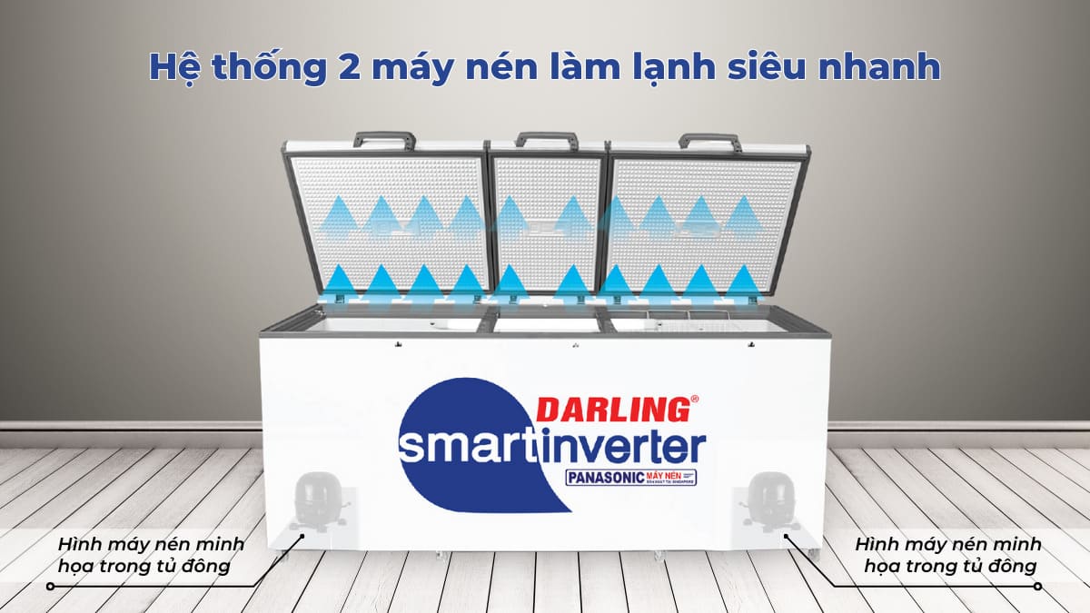 Đặc biệt để đáp ứng khả năng lưu trữ nhiều thực phẩm, Tủ Đông Darling Inverter 1400 Lít DMF-1279ASI được trang bị đến 2 máy nén. Nhờ hệ thống máy nén này mà tủ được gấp đôi sức mạnh, làm lạnh nhanh hơn và êm ái hơn. Mặc dù chiếc tủ đông này thuộc dòng dung tích lớn nhưng mọi người xung quanh không bị làm phiền khi tủ vận hành.