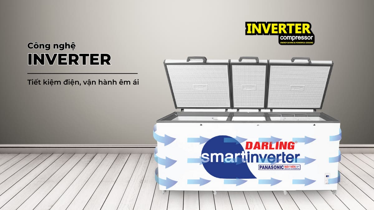 Có khá nhiều người dùng thường lo lắng về vấn đề điện năng tiêu thụ khi sử dụng dòng tủ đông có dung tích lớn. Nhưng với Tủ Đông Darling Inverter 1400 Lít DMF-1279ASI người dùng có thể phần nào yên tâm bởi tủ đã được trang bị công nghệ biến tần Inverter hiện đại. Cụ thể công nghệ này sẽ giúp điều chỉnh tốc độ quay của máy nén linh hoạt để đáp ứng đủ nhu cầu sử dụng thực tế và duy trì nhiệt độ ở mức ổn định. Với cách hoạt động này, công nghệ Inverter giúp tủ tối ưu hóa lượng điện tiêu thụ đáng kể.