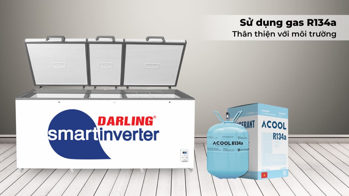 Tủ Đông Darling Inverter 1400 Lít DMF-1279ASI sử dụng gas R134 – môi chất làm lạnh được sử dụng phổ biến để thay thế cho những dòng gas thế hệ trước. R134a là dòng gas không chứa Clo nên sẽ hạn chế được những tác động xấu đến tầng Ozon. Đồng thời gas R134a không chứa các chất độc hại nên người dùng có thể yên tâm khi sử dụng chiếc tủ đông Darling này.