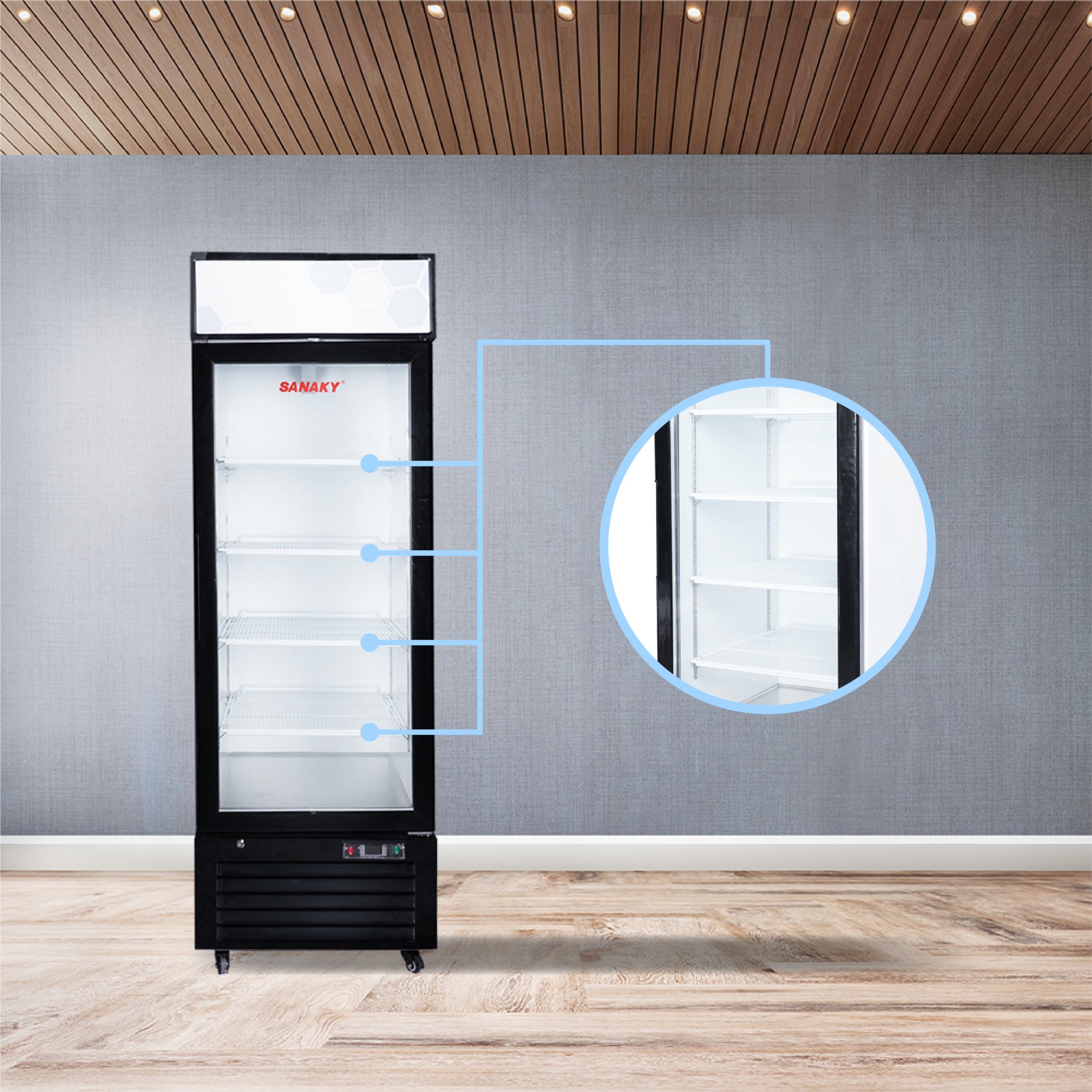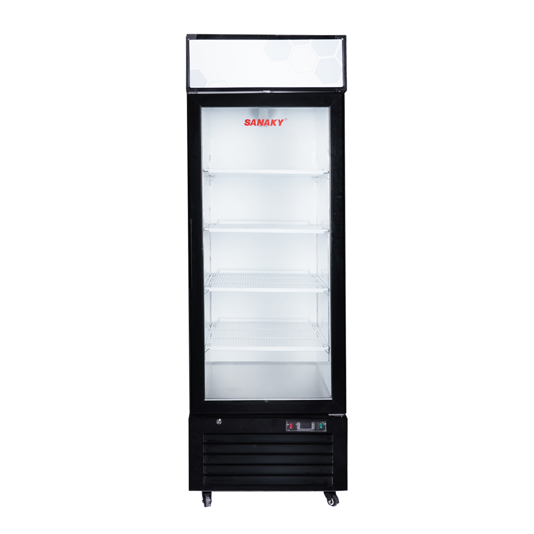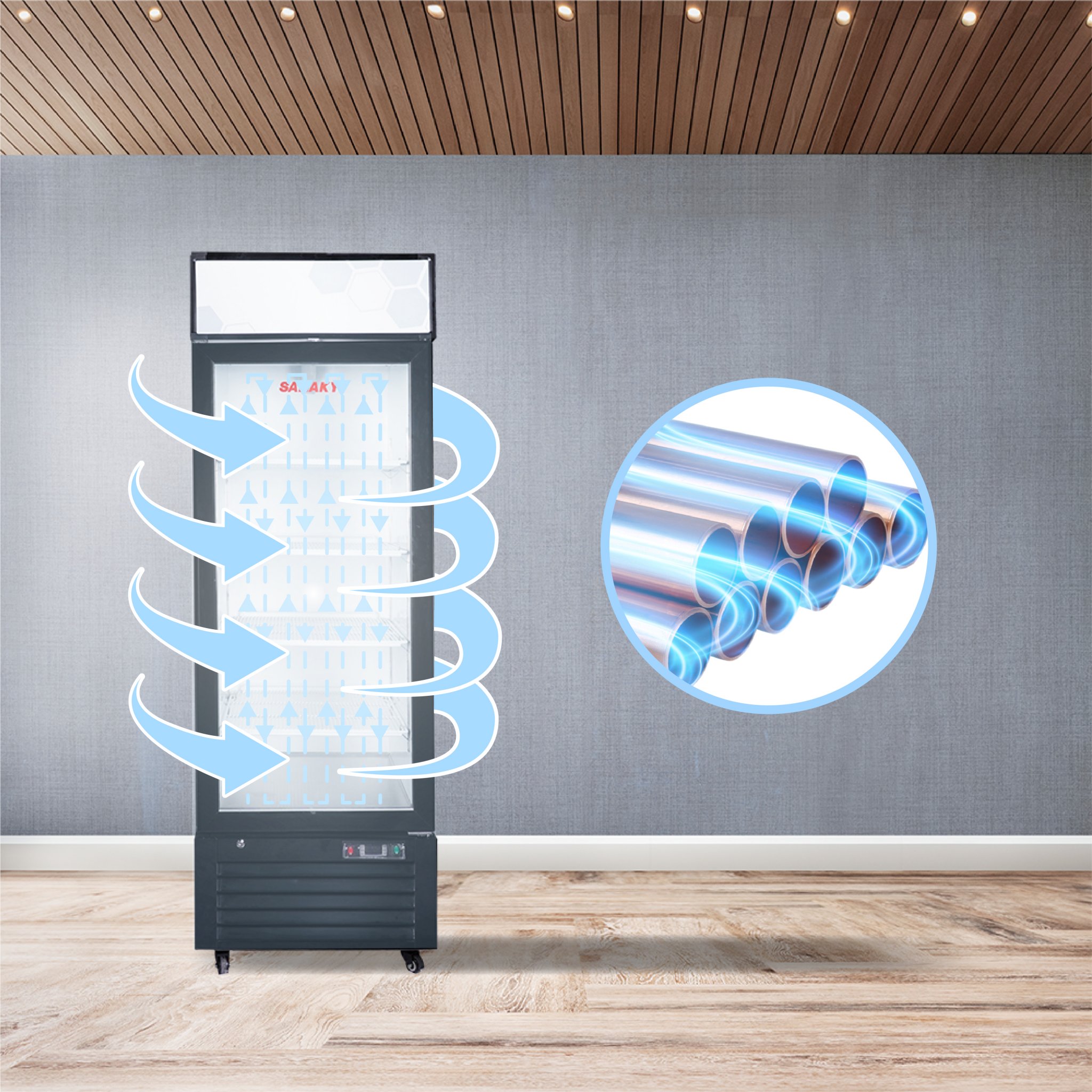 Kính của tủ là loại mặt kính 3 lớp hút chân không kết hợp sử dụng công nghệ sấy kính điện trở âm giúp cho mặt kính luôn được khô ráo, không đọng sương, phù hợp cho việc quan sát thực phẩm trưng bày trong tủ.