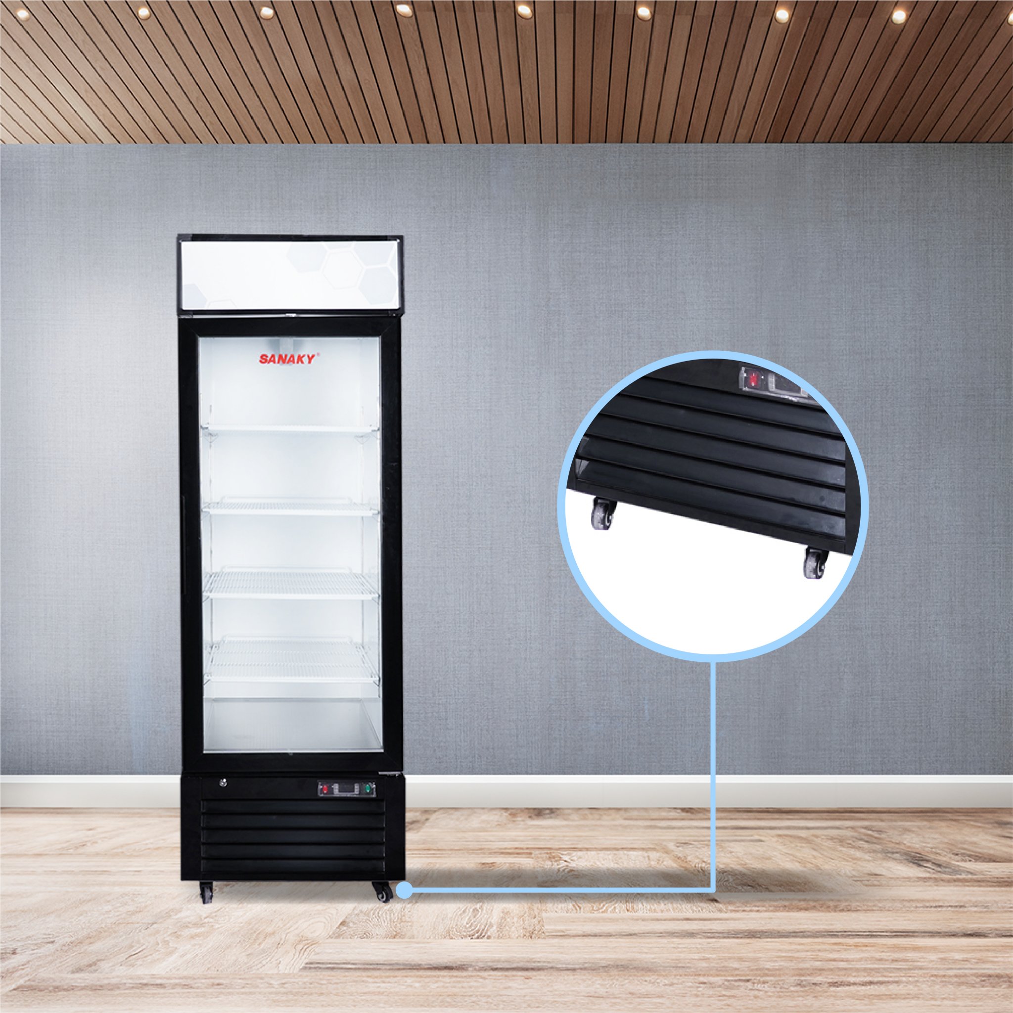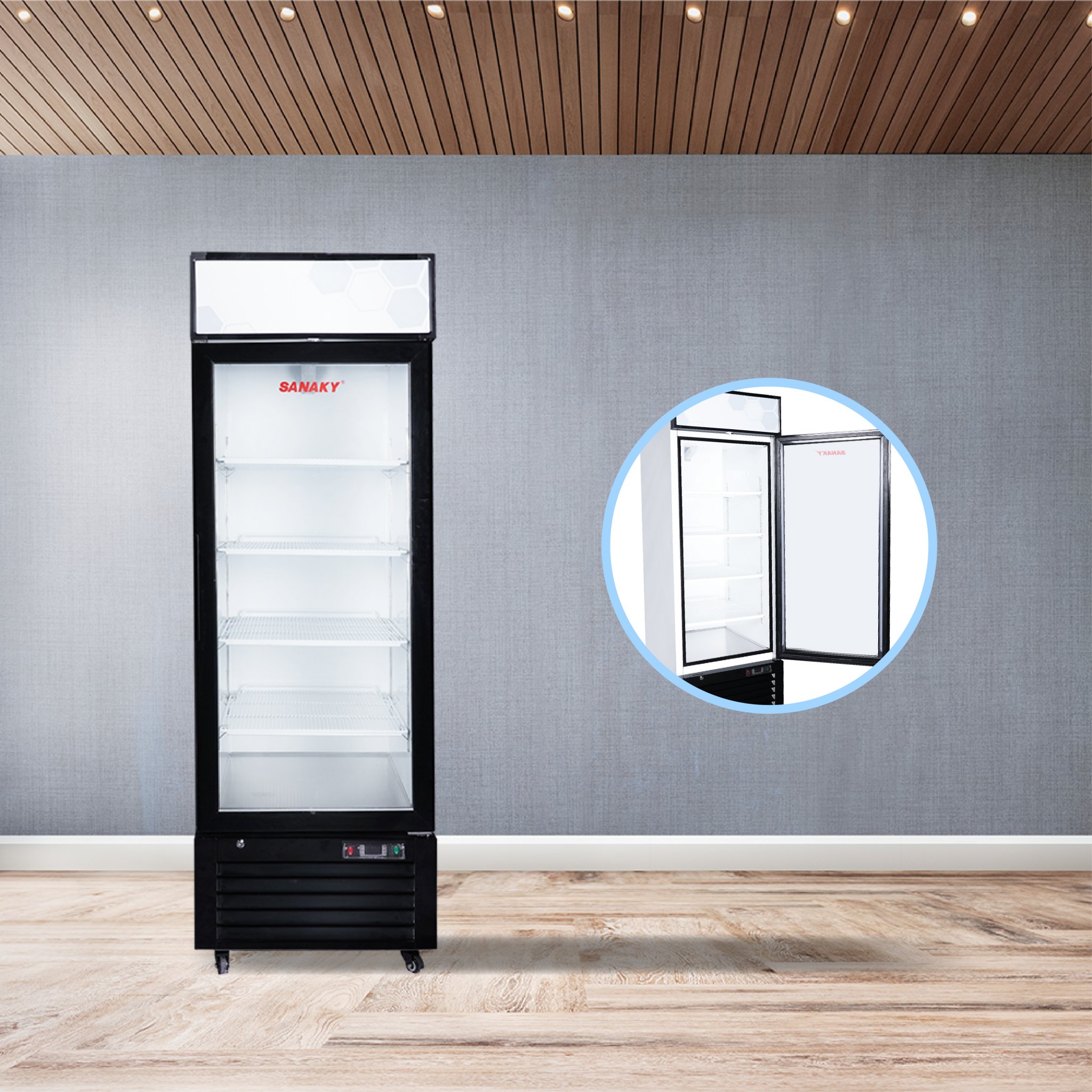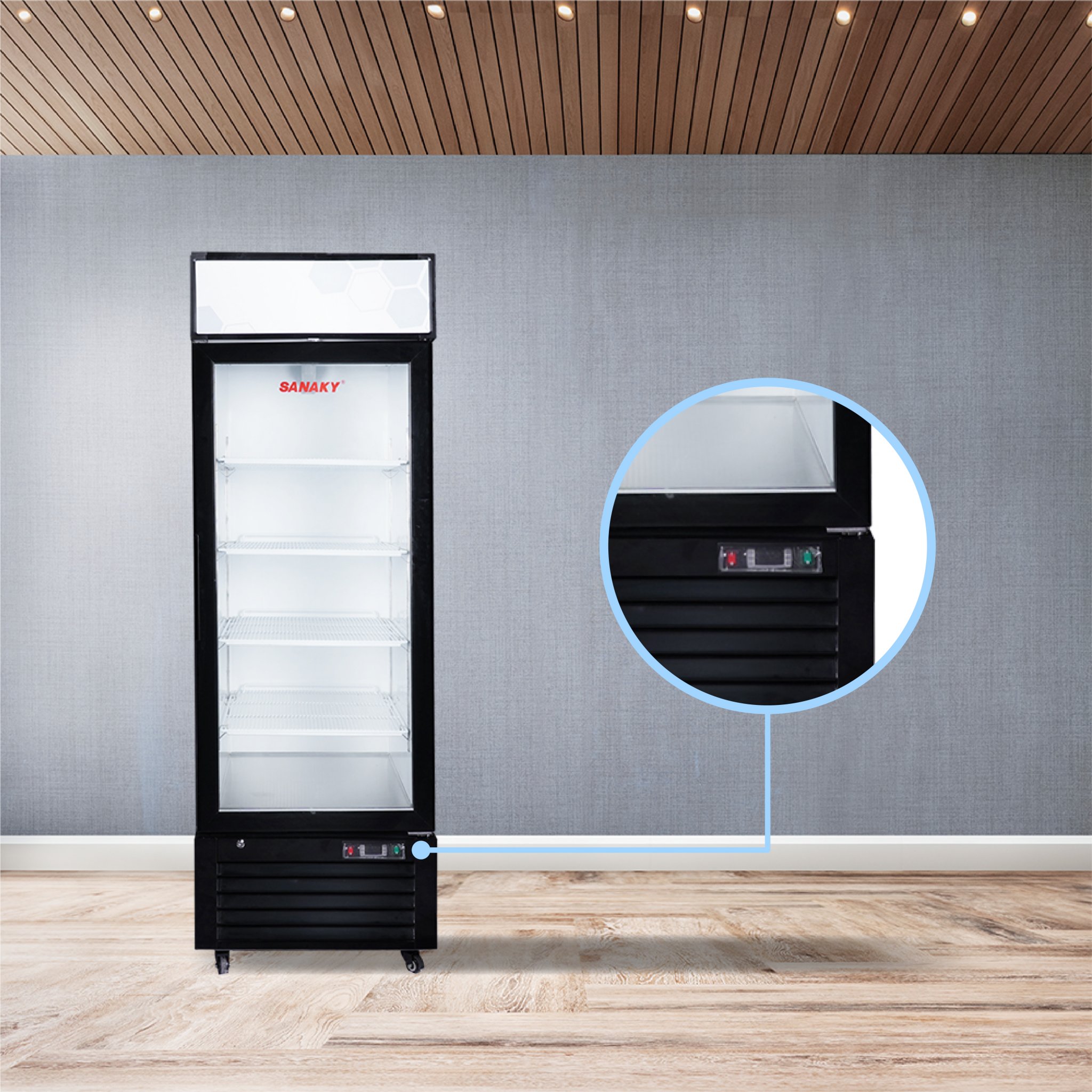 Kính của tủ là loại mặt kính 3 lớp hút chân không kết hợp sử dụng công nghệ sấy kính điện trở âm giúp cho mặt kính luôn được khô ráo, không đọng sương, phù hợp cho việc quan sát thực phẩm trưng bày trong tủ.