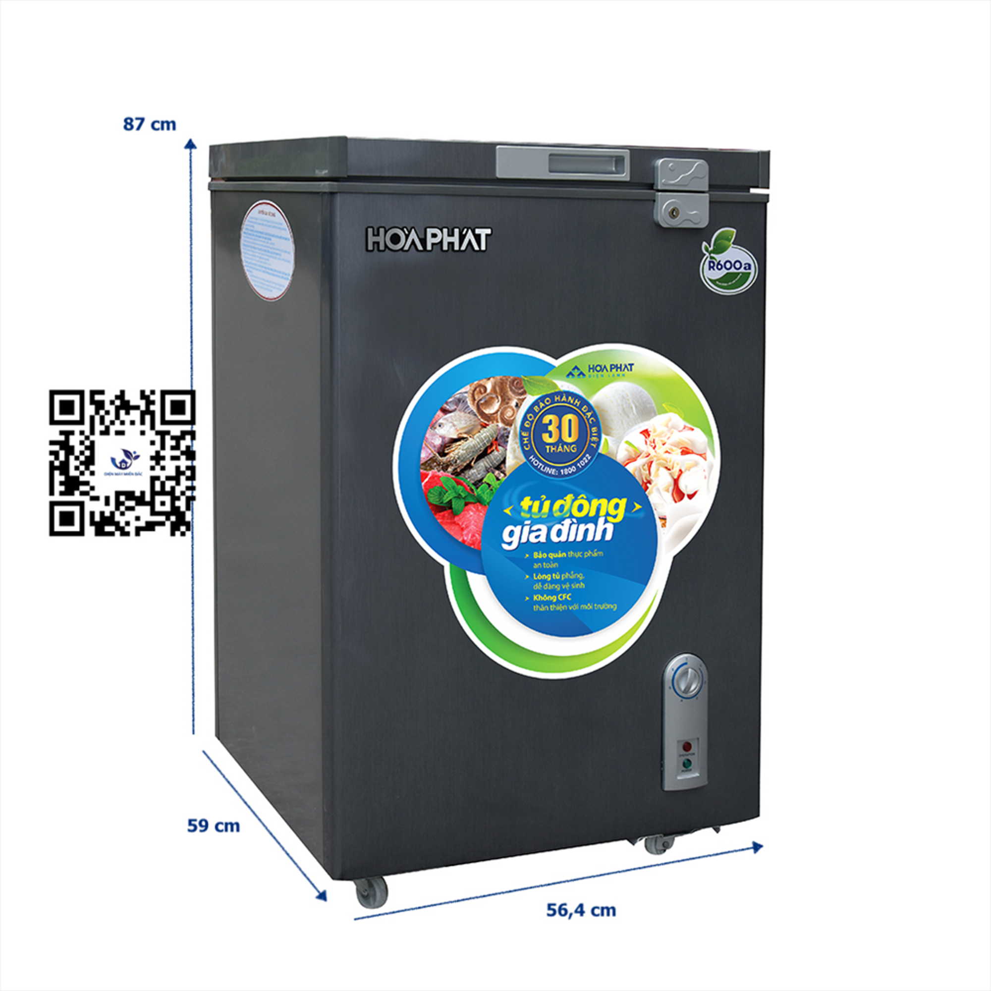 Tủ đông Hòa Phát 107 Lít HPF AD6107G làm lạnh nhanh chóng, tiết kiệm điện năng với công nghệ làm lạnh trực tiếp, dàn lạnh bằng đồng và gas R600a, sử dụng và vệ sinh tiện lợi với các tiện ích giỏ đựng đồ, khóa cửa tủ, bánh xe và xẻng cạo tuyết.