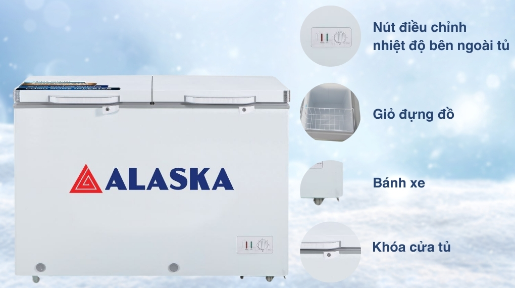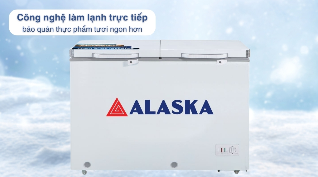 – Tủ đông Alaska được trang bị công nghệ Inverter làm lạnh nhanh chóng, vận hành êm ái. Nhờ vậy thực phẩm không chỉ được bảo quản tốt hơn mà còn góp phần giảm thiểu đáng kể lượng điện năng tiêu thụ cho gia đình bạn.