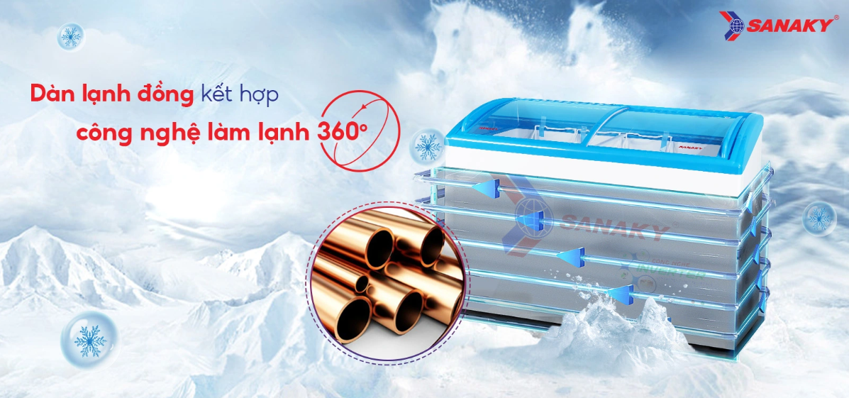 Công nghệ làm lạnh 360 độ: kết hợp với dàn lạnh đồng, công nghệ làm lạnh 360 độ giúp hơi lạnh sẽ được tỏa đều bên trong tủ, tác động toàn diện lên bề mặt thực phẩm, đem đến hiệu quả làm lạnh sâu, đóng đông triệt để.