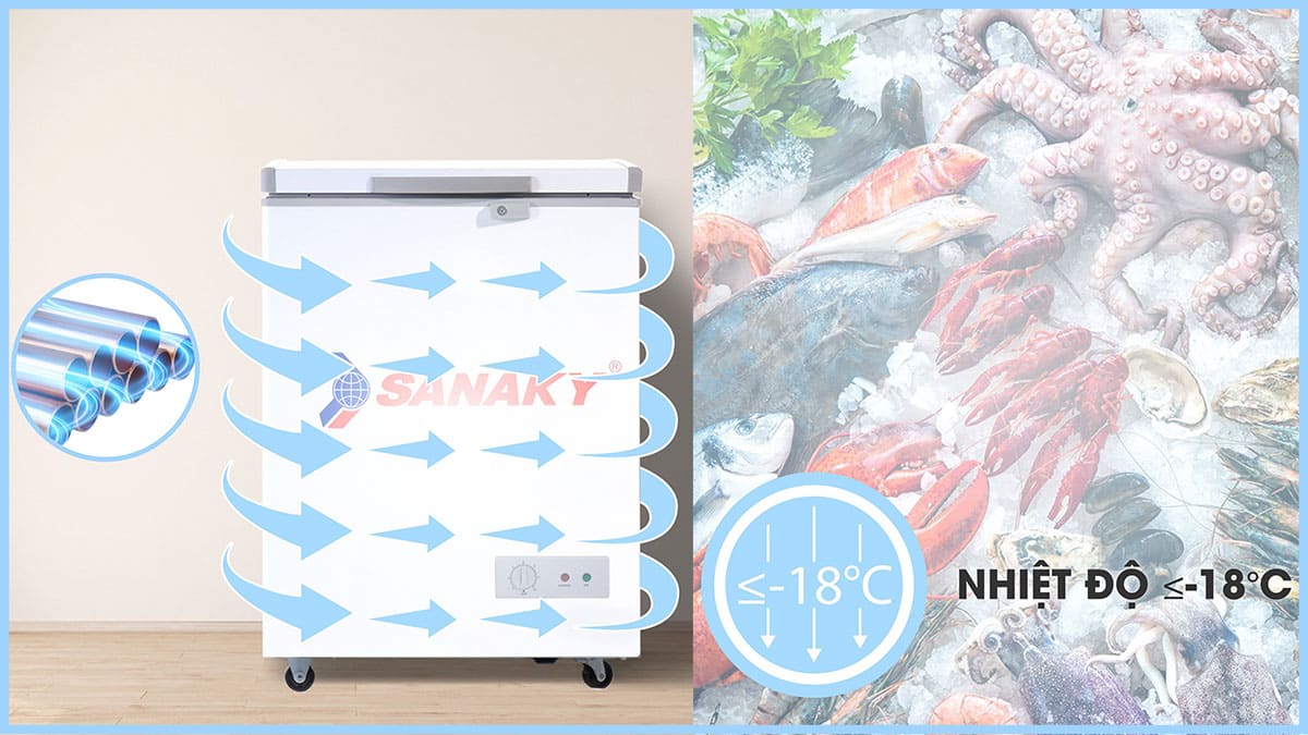 Tủ đông Sanaky này được trang bị dàn lạnh bằng đồng, kết hợp với công nghệ làm lạnh 360 độ, mang đến nhiều ưu điểm vượt trội. Dàn lạnh bằng đồng nguyên chất giúp tủ đông Sanaky dẫn nhiệt nhanh hơn, đồng thời vận hành êm ái và tiết kiệm điện. Với khả năng dẫn nhiệt tốt, dàn lạnh đồng đảm bảo tủ làm lạnh nhanh chóng, đồng thời duy trì nhiệt độ ổn định trong suốt quá trình sử dụng.