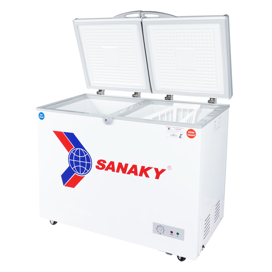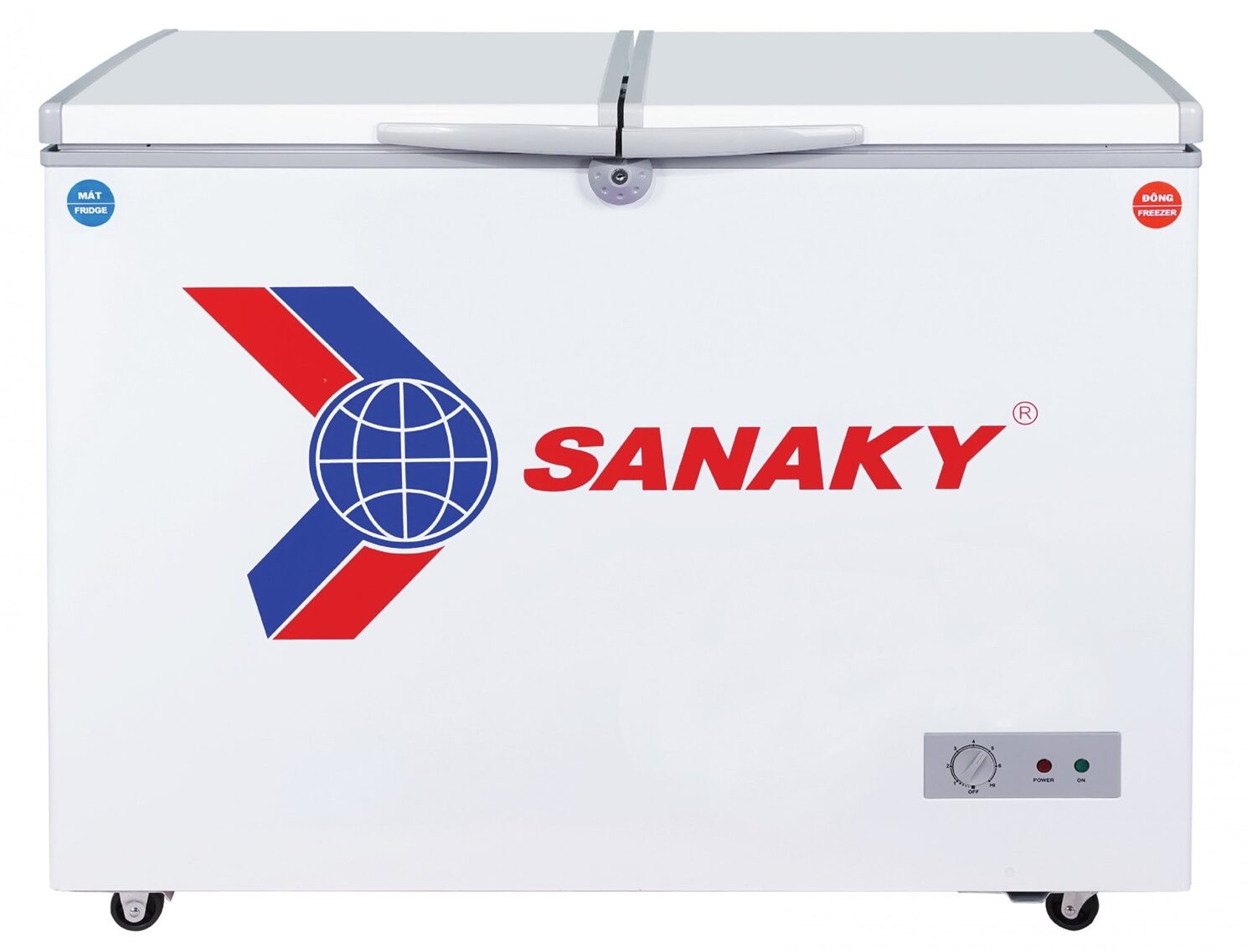 Tủ đông Sanaky có thiết kế 2 cửa, cửa mở trên và có khoá, được trang bị bánh xe để thuận tiện hơn khi di chuyển.