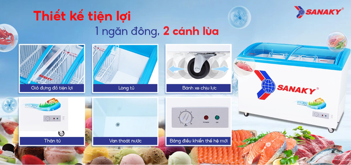 Cánh lùa Tủ Đông Sanaky VH-4899K thiết kế bởi 2 cánh kính cường lực được phủ lớp phản xạ không hấp thụ nhiệt giảm khả năng thoát nhiệt