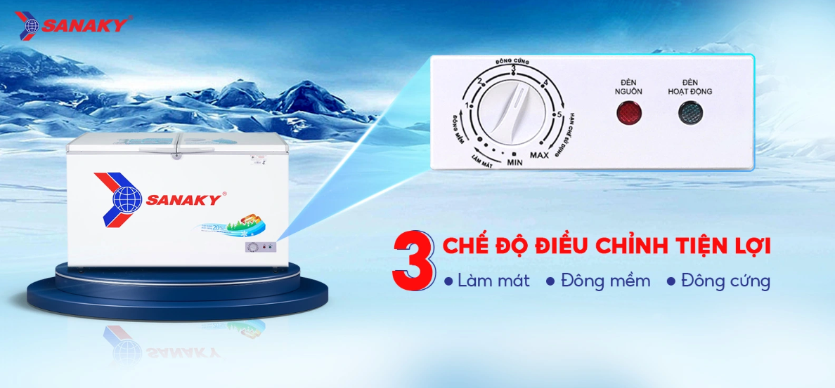 Tủ Đông Sanaky VH-3699A1 được trang bị bảng điều chỉnh tiện ích với 3 chế độ “Mát – Đông mềm – Đông cứng” phù hợp với mọi loại thực phẩm tiện lợi cho người sử dụng theo dõi nhiệt độ trong tủ: