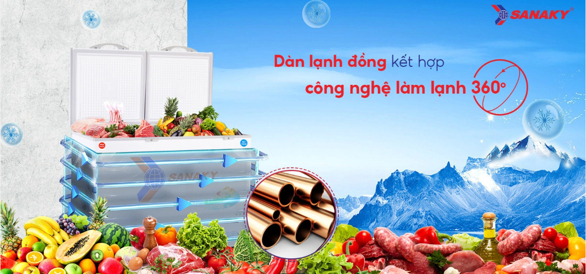 Công nghệ làm lạnh 360 độ: kết hợp với dàn lạnh đồng, công nghệ làm lạnh 360 độ giúp hơi lạnh sẽ được tỏa đều bên trong tủ, tác động toàn diện lên bề mặt thực phẩm, đem đến hiệu quả làm lạnh sâu, đóng đông triệt để.
