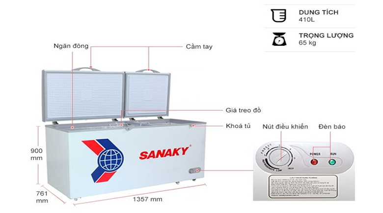 Tủ đông Sanaky VH-568HY2 có dung tích thực 410 lít và kích thước lòng tủ khá sâu cho khả năng đựng được lượng thực phẩm với khối lượng lớn, rất thích hợp với những quán ăn, nhà hàng, cửa hàng đông lạnh…
