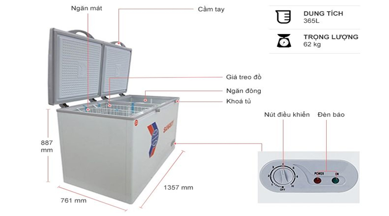 Tủ đông dung tích tổng 560 lít, dung tích thực 365 lít giúp bạn có thể cất giữ thịt, cá, thực phẩm chế biến sẵn với khối lượng lớn.