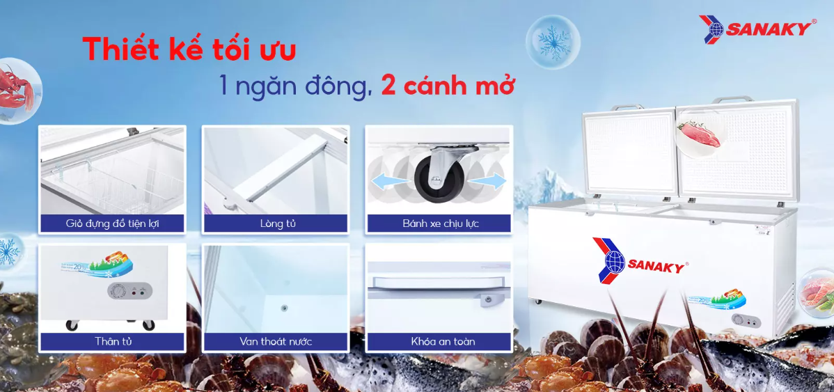 Thiết kế Tủ Đông Sanaky VH-8699HY 1 ngăn đông và 2 cánh mở mang đến sự tiện lợi cho bạn trong việc tìm kiếm và sắp xếp thực phẩm trong tủ cũng như giảm bớt tình trạng hơi lạnh thoát ra ngoài gây tiêu hao điện năng.