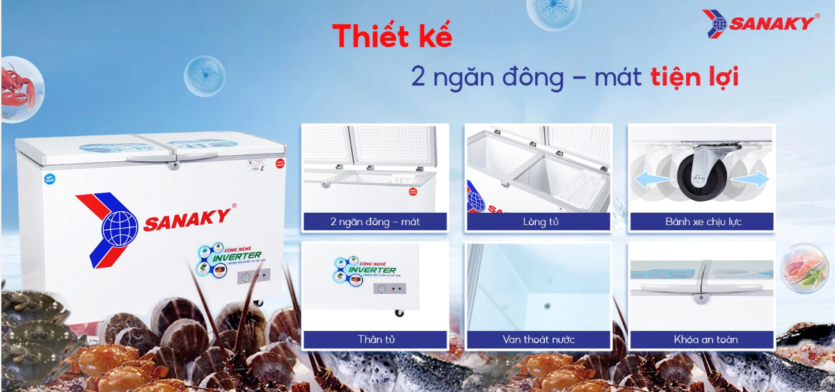 Thiết kế Tủ Đông Sanaky VH-3699W3 gồm 2 ngăn đông – mát và 2 cánh mở giúp dễ dàng phân loại thực phẩm