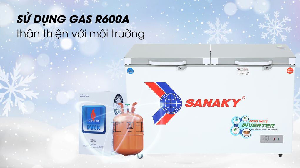 Sanaky đã trang bị Gas R600a thân thiện với môi trường không những nâng cao khả năng làm đông nhanh mà còn giúp bạn tiết kiệm điện năng tiêu thụ (tiêu thụ trung bình 220 kWh/năm) so với những dòng tủ đông sử dụng Gas đời cũ.
