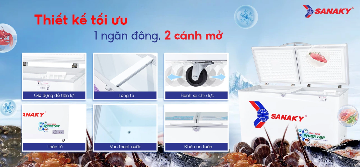 Tủ Đông Sanaky VH-3699A3 có thiết kế 1 ngăn đông và 2 cánh mở mang đến sự tiện lợi cho bạn trong việc tìm kiếm và sắp xếp thực phẩm trong tủ cũng như giảm bớt tình trạng hơi lạnh thoát ra ngoài gây tiêu hao điện năng.