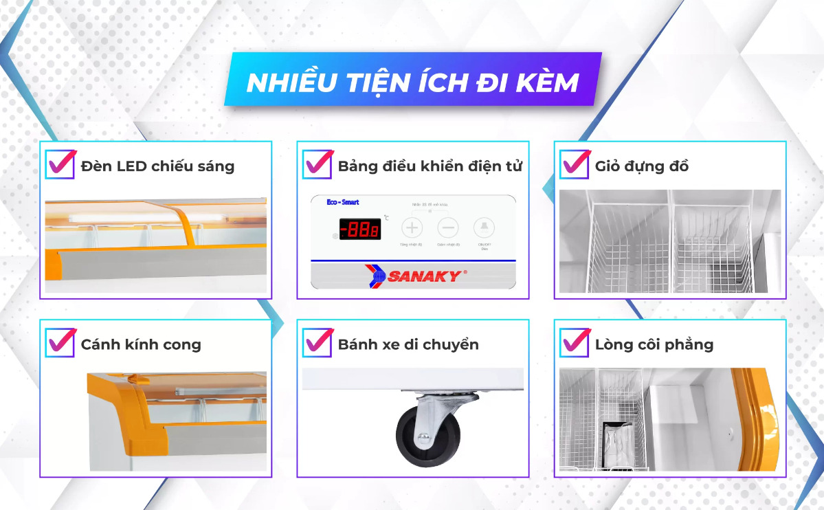 Đèn LED chiếu sáng giúp màu sắc thực phẩm trong tủ thêm hấp dẫn: Tủ đông Sanaky được thiết kế với hệ thống đèn LED trong thân tủ, chiếu sáng toàn bộ các góc khuất giúp trưng bày các sản phẩm bắt mắt và thu hút. Hơn nữa, hệ thống đèn LED còn tiết kiệm điện năng và có tuổi thọ bền bỉ hơn nhiều lần so với các loại đèn huỳnh quang, đèn sợi đốt,… mang lại giá trị sử dụng lâu dài cho người sử dụng.