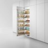 Thiết kế dạng hộp góp phần tạo cảm giác nhẹ nhàng, thanh thoát cho tủ kho. Ngoài ra với thiết kế 6 tầng, 12 rổ đựng thì được thiết kế thu gọn trong khoang tủ góp phần tăng tính thẩm mĩ, tạo sự gọn gàng cho căn bếp nhà bạn.