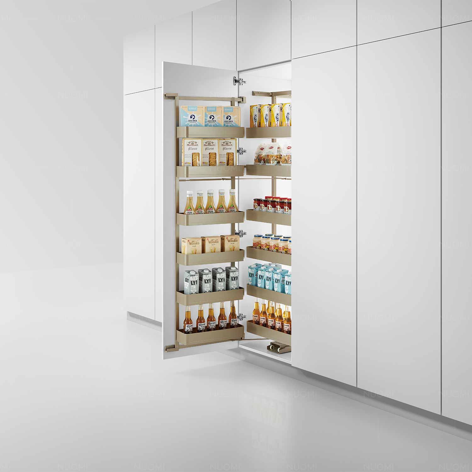 Thay vì xếp đồ đạc một cách không khoa học tạo nên sự bề bộn cho bếp thì tủ kho sẽ đem tới cho bạn sức chứa vô cùng lớn giúp căn bếp luôn sạch sẽ, gọn gàng. Với thiết kế 6 tầng – 12 rổ đựng cùng tải trọng 5kg/mỗi rổ lớn và 3kg/ mỗi rổ nhỏ, bạn có thể tha hồ cất gọn tất cả các vật dùng, đồ ăn.. vào khoang tủ phía sau cánh cửa tủ.