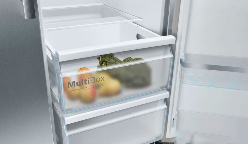 Ngăn kéo MultiBox trong tủ lạnh Bosch serie 4 KAN93VIFPG được thiết kế đáy ngăn kéo có các lớp lượn sóng giữ sự tươi mát cho rau và trái cây lâu hơn so với ngăn kéo tiêu chuẩn.