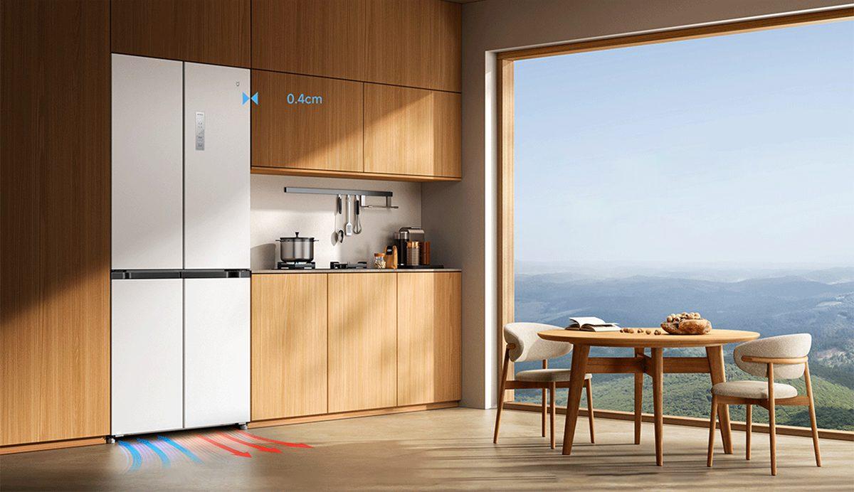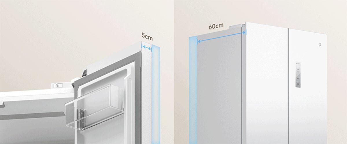 Tủ lạnh Xiaomi Mijia 508L có thiết kế bên ngoài siêu mỏng, phần thân máy chỉ dày 60cm với bề mặt trước tủ là 85.2cm. Nhờ việc giảm đi 12.8% kích thước của thân tủ và 19.4% bề dày cửa, sản phẩm này tối ưu diện tích đến 36.7% so với những sản phẩm tủ lạnh có dung tích tương đương. Điều này giúp mọi người lắp đặt tủ theo kiểu âm tường, tận dụng tốt nhất diện tích, không gian bếp, phù hợp cho nơi có không gian hạn chế.